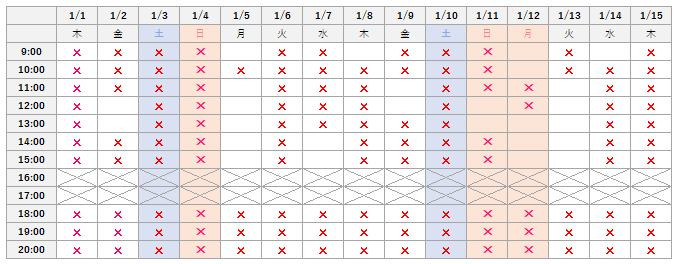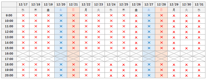 Lagoonは年中無休で営業しております。空欄は全て施術可能です!カレンダー下のご予約の目安を参考にご希望の時間をご指定ください